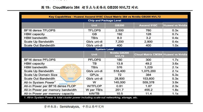 (2)算力:可提供达300PFLOPS的密集BF16算力 ,接近英伟达超节点GB200 NVL72的两倍,总内存容量超出英伟达的3.6倍,内存带宽2.1倍,为大规模AI训练和推理提供了高效的硬件支持;