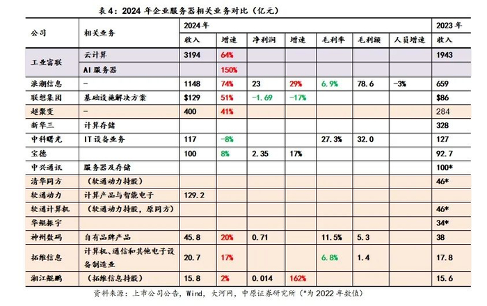 从2024年服务器行业业绩来看,不同阵营的企业之间的分化也更加明显。受益于海外科技大厂2024年资本开支增长快于国内,对标海外需求的工业富联增长最为明显。浪潮作为国内互联网厂商服务器的最大供应商,2024年服务器业务增幅明显,但是毛利率显著下滑。国产服务器供应商分化明显,超聚变作为第一大国产服务器供应商,2024年增速明显提升,而神州数码的自有品牌业务下半年销售额不及上半年,增速不及预期。