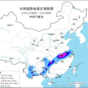 预计,6月21日08时至22日08时,江苏中南部、安徽中南部、江西北部、湖北中东部、湖南中北部和西部、重庆南部、贵州东部、广西西部和北部、云南中部和南部等地的部分地区有暴雨到大暴雨,其中,安徽西部、湖北东部等地局部地区有特大暴雨(250~270毫米)(见图1)。上述部分地区伴有短时强降水(最大小时降雨量20~50毫米,局地可超过70毫米),局地有雷暴大风等强对流天气。中央气象台6月21日06时继续发布暴雨橙色预警。
