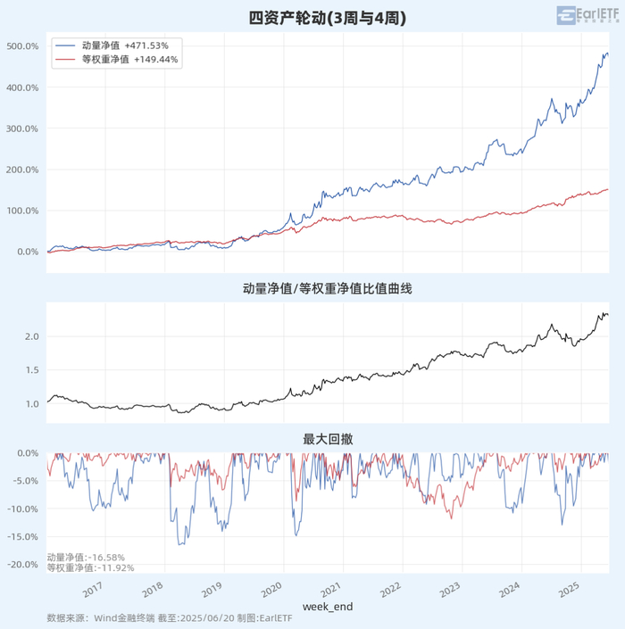 基于沪深300、中国国债、纳斯达克、黄金四资产,以3周和4周并行回溯参数进行轮动