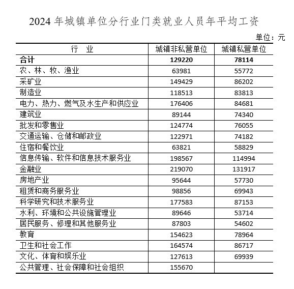 2024年,江苏省城镇非私营单位就业人员年平均工资为129220元,城镇私营单位就业人员年平均工资为78114元。分行业门类的城镇单位就业人员年平均工资详见下表。