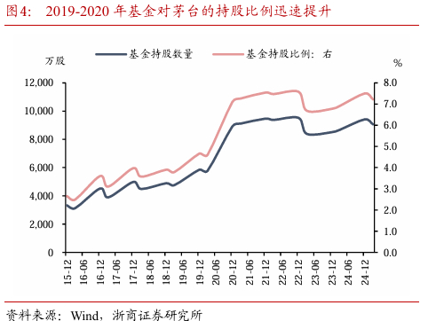 债市跨季行情或在基金抢跑抱团长债下进一步走强,关注长债及超长债的投资机会。几年前A股市场中的核心资产常出现机构抱团现象,通常机构抱团使得相关股票价格不断上涨,形成了“抱团-上涨-申购-继续买入抱团股-吸引资金加入抱团-抱团股继续上涨”的正反馈循环。以茅台为例,2019年-2020年间基金持有茅台股占比持续提升,进一步助推股价持续上涨。类比来看,近期债市跨季行情或已在基金抢跑抱团下提前启动,虽然利率下行偏缓,但总体上利空有限,建议投资者关注长债及超长债的投资机会。