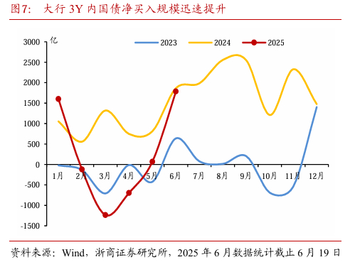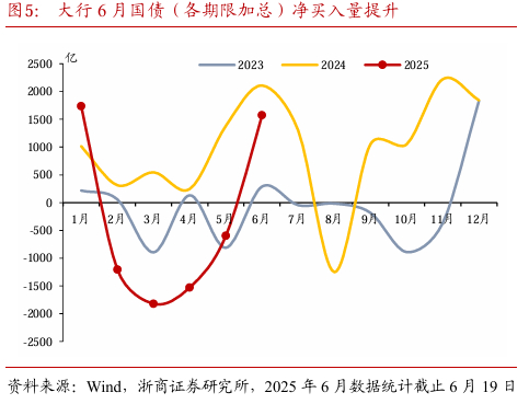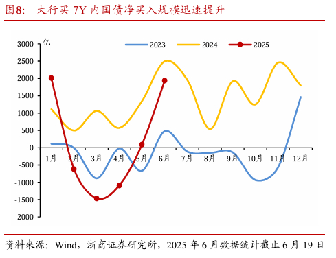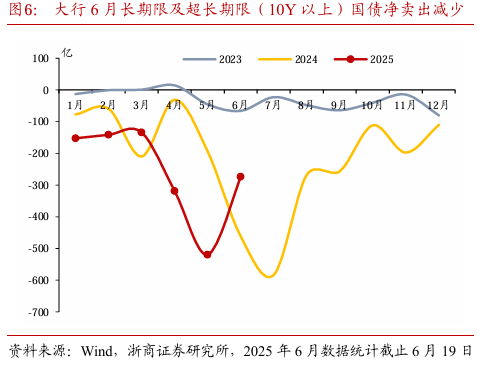 2.大行买债开始起量:2025年截止6月19日,大行净买入中短债规模已接近2024年6月整月水平,大行6月对中短期国债净买入规模或同比提升,对长期限及超长期限国债的净卖出规模或同比下降,关注央行6月买债的可能性。