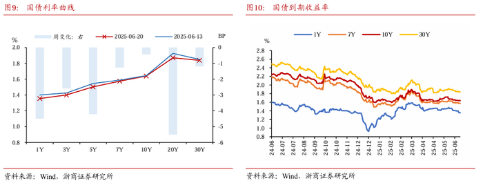 过去一周(2025年6月16日-2025年6月20日)央行买断式逆回购叠加重启买债预期下利率曲线偏牛陡,但20Y和50Y国债表现亮眼。6月16日,央行开展4000亿买断式逆回购,税期扰动下资金面总体均衡偏宽松。6月17日,投资者对央行重启买债预期较强,债市利率迅速下行,短债表现优于长债。6月18日,陆家嘴金融论坛在上海举办,货币政策及稳资本市场相关政策基本符合预期,债市表现偏平淡,部分投资者止盈。6月19日受机构行为扰动,投资者对银行季末卖债有所担忧,债市小幅调整。6月20日税期已过,资金面早盘较紧但尾盘转松,债市利率重回下行通道。整周来看,受货币宽松预期和资金面超预期平稳影响,短债表现略好,但超长品种中20Y和50Y国债表现亮眼。