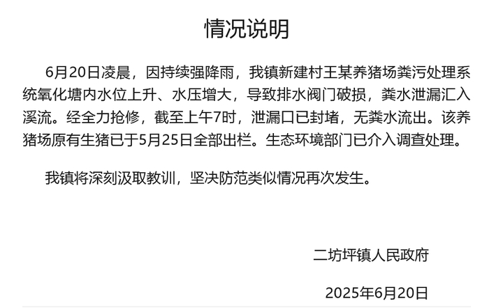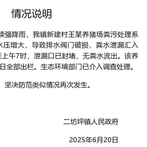 6月20日凌晨,因持续强降雨,我镇新建村王某养猪场粪污处理系统氧化塘内水位上升、水压增大,导致排水阀门破损,粪水泄漏汇入溪流。经全力抢修,截至上午7时,泄漏口已封堵,无粪水流出。该养猪场原有生猪已于5月25日全部出栏。生态环境部门已介入调查处理。