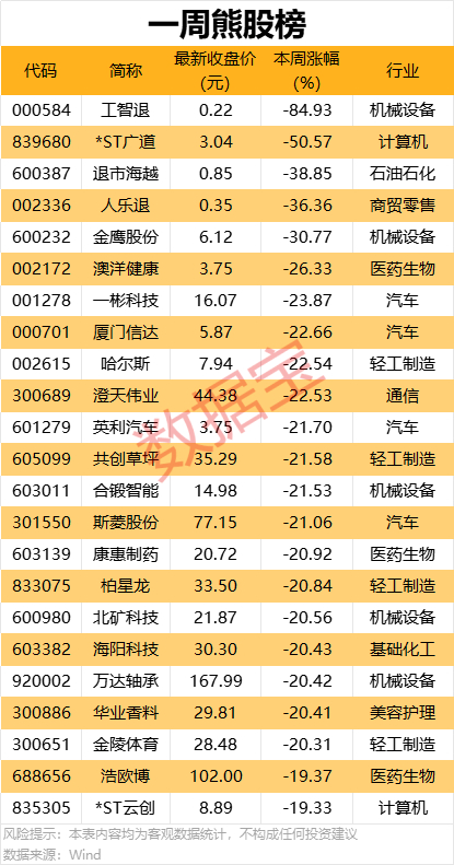 本周累计下跌的个股中,21股跌幅在20%以上,工智退、*ST广道累计跌超50%。