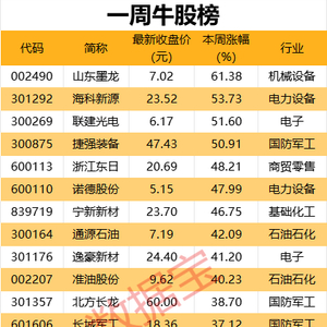 本周涨超30%的个股中,按所属行业统计,电力设备和电子行业均有4股上榜,其次是国防军工行业,有3股上榜。