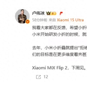 【环球网科技综合报道】6月19日消息,小米集团合伙人、总裁卢伟冰近日在其个人微博上宣布,小米MIX Flip 2折叠屏手机将于下周正式与消费者见面。