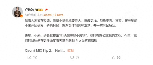 卢伟冰在相关表述中提到,消费者对于小折叠屏手机的电池容量、折痕处理和散热性能等方面有着较高期待。他透露,早在三年前小米启动小折叠屏手机研发时,就已关注到这些需求并持续致力于技术突破。“去年,小米小折叠就提出‘拒绝做美丽小废物’,力求让用户获得直板旗舰的使用体验。”卢伟冰表示,今年小米的目标是在更多维度向Pro级直板旗舰看齐,甚至实现超越。