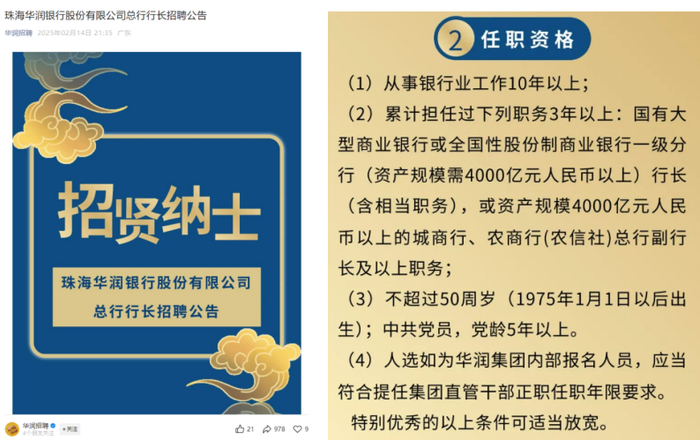 令人诧异的是,华润银行并非将副行长内部晋升行长作为第一选择。机构之家注意到,就在钱曦被银行内部官选为董事长之后,华润银行即开始紧锣密鼓地进行全国招募行长。今年2月,“华润招聘”公众号发布公开海选总行行长一职。从此次招聘要求来看,应聘者需从事银行业工作10年以上,年龄不超过50岁,且要求应聘者曾任职机构规模与华润银行相当,或者更高,即国有大型商业银行或全国性股份制商业银行一级分行(资产规模需4000亿元人民币以上)行长(含相当职务);或者资产规模4000亿元人民币以上的城商行、农商行(农信社)总行副行长及以上职务。而在钱曦曾参加的2023年华润银行海选行长招聘中,要求应聘者曾任职机构的资产规模仅需达到3000亿元,在年龄要求上则为“1970年以后出生”,由此可见本次海选行长已进一步收紧了相关要求。