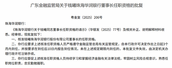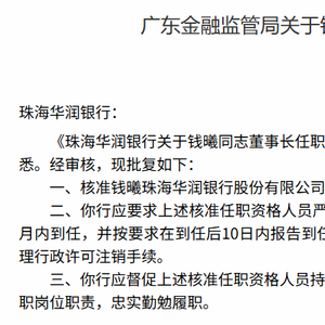 6月20日,国家金融监督管理总局广东监管局发布批复(粤金复〔2025〕206号),核准钱曦珠海华润银行股份有限公司(以下简称“华润银行”)董事长的任职资格。