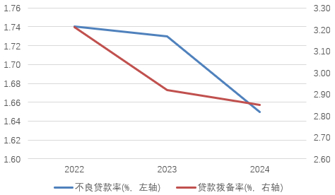 这看似矛盾的现状,实际上则为同一事件的两面。事实上,华润银行加回核销之后不良生成仍保持较快增长,因此在大幅计提大幅核销的背景下,虽然不良率表面上是下降了,但造成的高信用成本仍影响该行的净利润表现。在此背景下,该行整体拨备水平也仍在下降通道之中,其中2024年贷款拨备率为2.85%,环比继续下降7BP。
