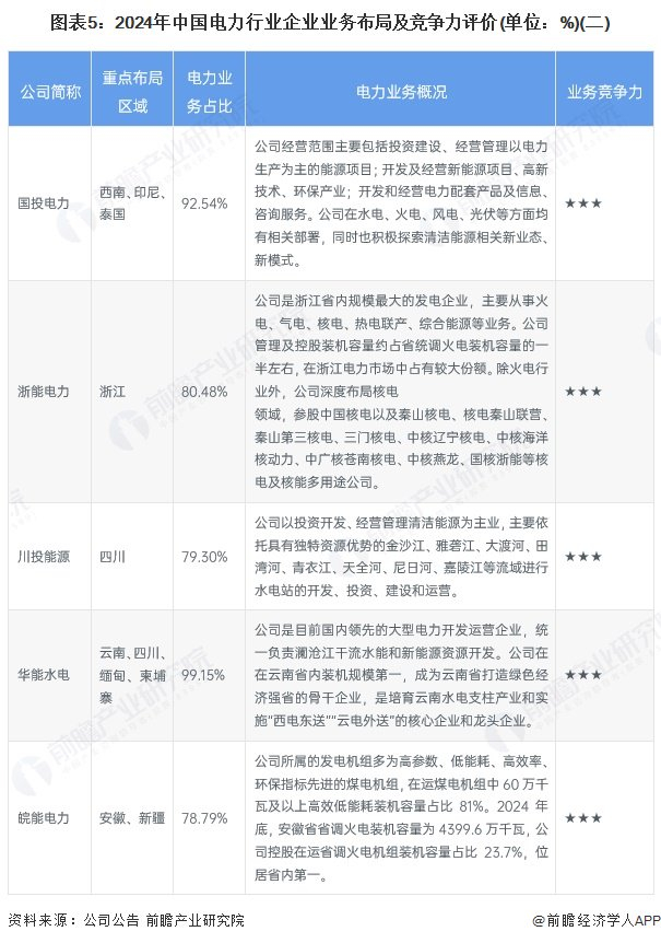 在行业相关上市公司中,目前,华能国际、国投电力、华能水电的电力业务布局区域遍布海内外;大部分上市公司电力业务的营收占比达90%;部分企业属于综合性能源集团,部分企业则是专注于水电或核电等清洁能源业务。