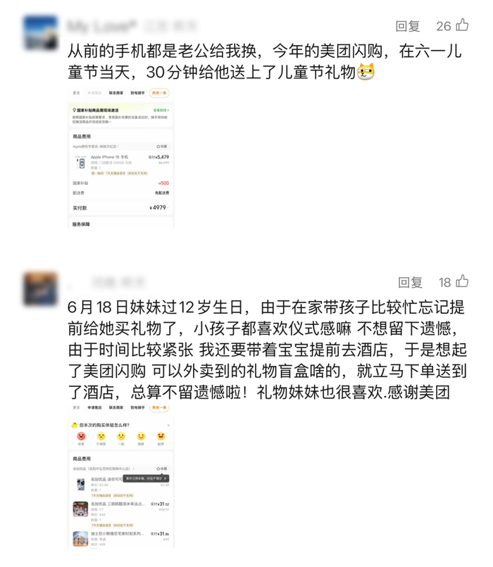 有网友分享在美团闪购上买国补手机的经历。“从前的手机都是老公给我换,今年六一儿童节当天,闪购30分钟给他送上了儿童节礼物。”这位网友送给老公的,是一台叠用了国补的iPhone 16。当传统抢购还在618比拼物流时效,即时零售已经让“节日惊喜”掐着分针抵达。