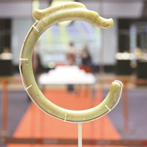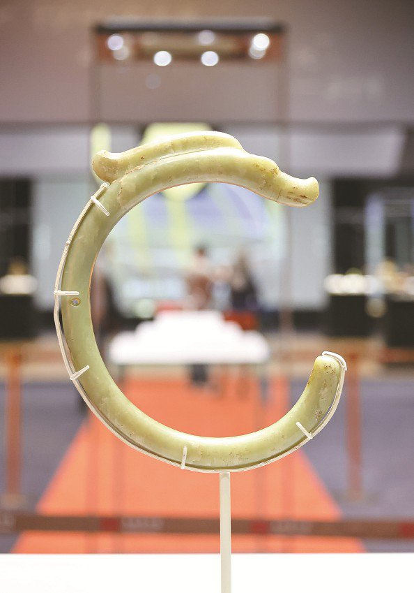 另一件开箱上架的重点文物是被誉为“中华第一龙”的“C”形玉龙(见左上图,记者 王凯 摄)。它高25.7厘米,最宽21.8厘米,是目前发现最古老的龙形玉器之一,距今约7000—6000年。观众进入展厅,第一眼便能看见它。