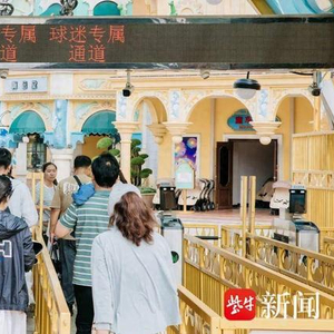 早上九点不到,中华恐龙园检票口已迎来南京游客。赛事期间,球迷凭本场“苏超”门票购买恐龙园及侏罗纪水世界门票可享5折优惠,且1日票可玩2天。来自安徽滁州的球迷尚元贝一家乘坐免费直通车抵达景区,直言“常州文旅福利太吸引人”。与此同时,拥有4000万粉丝的“四川观察”也在恐龙园进行直播,吸引超17万网友在线观看。