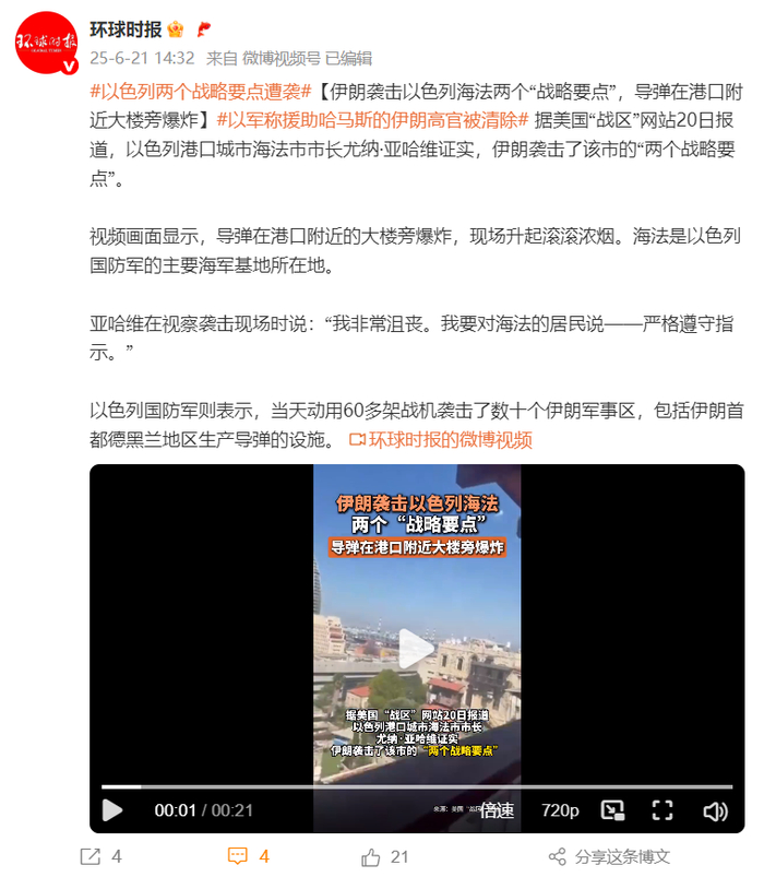 视频画面显示,导弹在港口附近的大楼旁爆炸,现场升起滚滚浓烟。海法是以色列国防军的主要海军基地所在地。