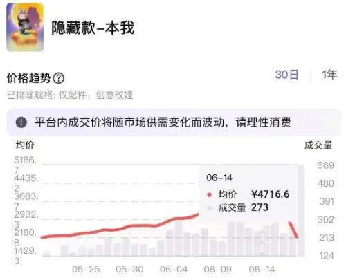 整盒(含6个盲盒)回收价从补货前的1500—2800元大幅跌至650—800元,最受追捧的隐藏款「本我」在二级市场的价格也大幅跳水。其成交均价从6月15日的4621元,骤降至6月18日的1921.4元。