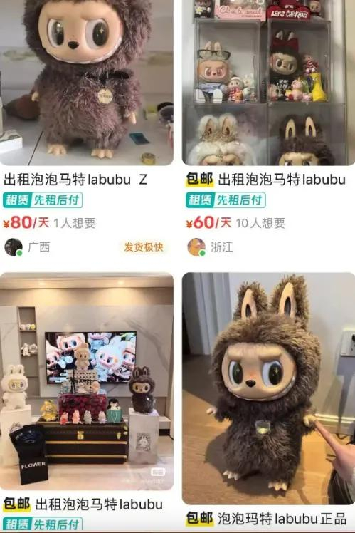 甚至,Labubu还出现了租赁生意,在二手交易平台上出租Labubu系列公仔赚钱,单只日租金从30元至80元不等。