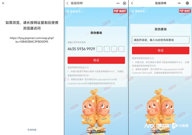 左一二为扫描后的盗版页面,右一为官方防伪小程序页面