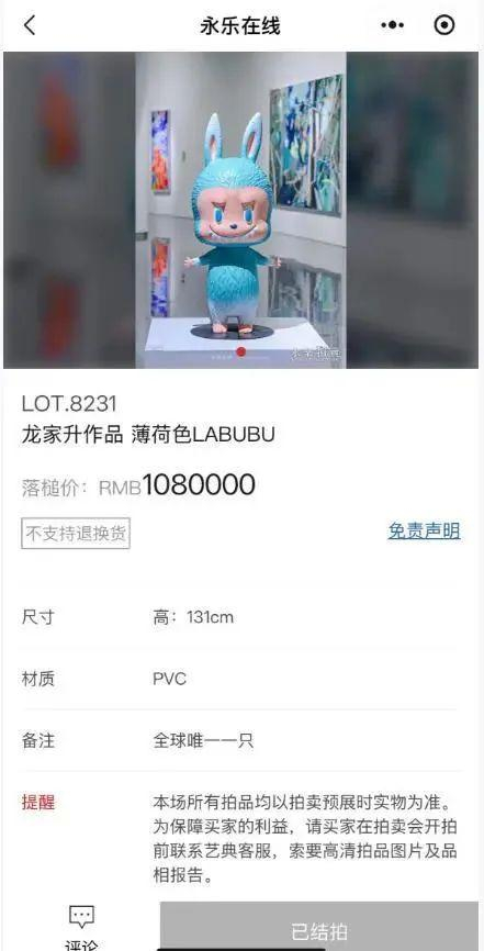 让黄牛们的情绪到达顶峰的,则是不久前的天价拍卖。6月10日,在永乐2025春季拍卖会上,一款显示为初代藏品级薄荷色的LABUBU最终以108万元的价格完成竞拍。据悉,此次拍卖出现在全球首场初代藏品级LABUBU艺术专场。该款LABUBU尺寸为高131cm,材质为PVC,颜色为薄荷色,在备注栏标注了“全球唯一一只”。除此之外,一款全球限量15版棕色LABUBU以82万元成交。