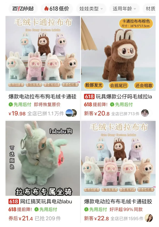 Lafufu或Lababa,网友们通常这样称呼那些“一眼假”的盗版 LABUBU,它们多姿多彩、形态各异、眼距不一的黑色大眼睛下,一排排牙咧出不同的弧度。甚至,Labubu还诞生了新的变种,比如Lagogo,一种长着Labubu脑袋的电子狗,可以边唱《Labubu之歌》边在地上乱走。