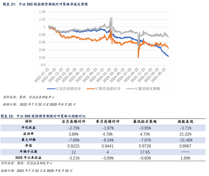 本周IC各合约基差贴水收窄,对冲策略本周出现回撤。截至2025年6月20日,最低贴水策略选择IC2507 合约。