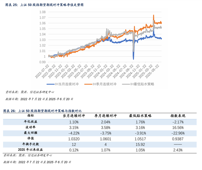 本周IH合约基差上行,贴水收窄,对冲策略本周出现回撤。截至2025年6月20日,最低贴水策略选择 IH2509 合约。