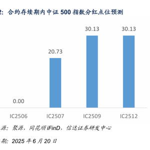 中证500指数在在次月合约IC2507存续期内分红点位预估为20.73,在当季合约IC2509存续期内分红点 位预估为30.13,在下季合约IC2512存续期内分红点位预估为30.13。指数在下季合约存续期内分红占比预估 为0.53%。