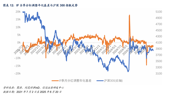 沪深300指数在次月合约IF2507存续期内分红点位预估为34.94,在当季合约IF2509存续期内分红点位 预估为48.09,在下季合约IF2512存续期内分红点位预估为48.4。指数在下季合约存续期内分红占比预估为 1.26%。
