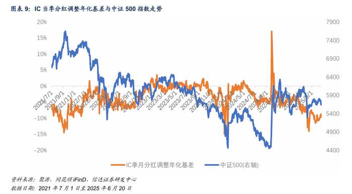 指数成分股分红对合约基差存在影响:截至2025年6月20日,本 周中证 500 成分股中有 59 只股票实施分红,股息点指数上升 10.04,占指数点位0.18%;沪深300成分股中有22只股票实施分红,股息点指数上升5.52,占指数点位0.14%;上证50成分股中有3只股票实施分红,股息点指数上升6.81,占指数点位0.25%;中证1000 成分股中有 94 只股票实施分红,估算股息点约 7.66, 约占指数点位0.13%。指数成分股年报分红对合约基差存在影响。
