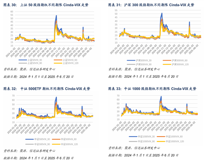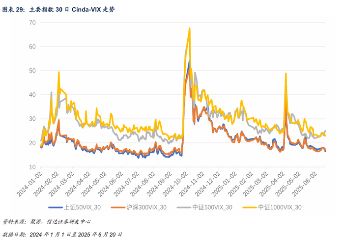 截至2025年6月20日,30日上证50VIX、沪深300VIX、中证500VIX与中证1000VIX分别为16.54、 17.01、25.03及22.92。
