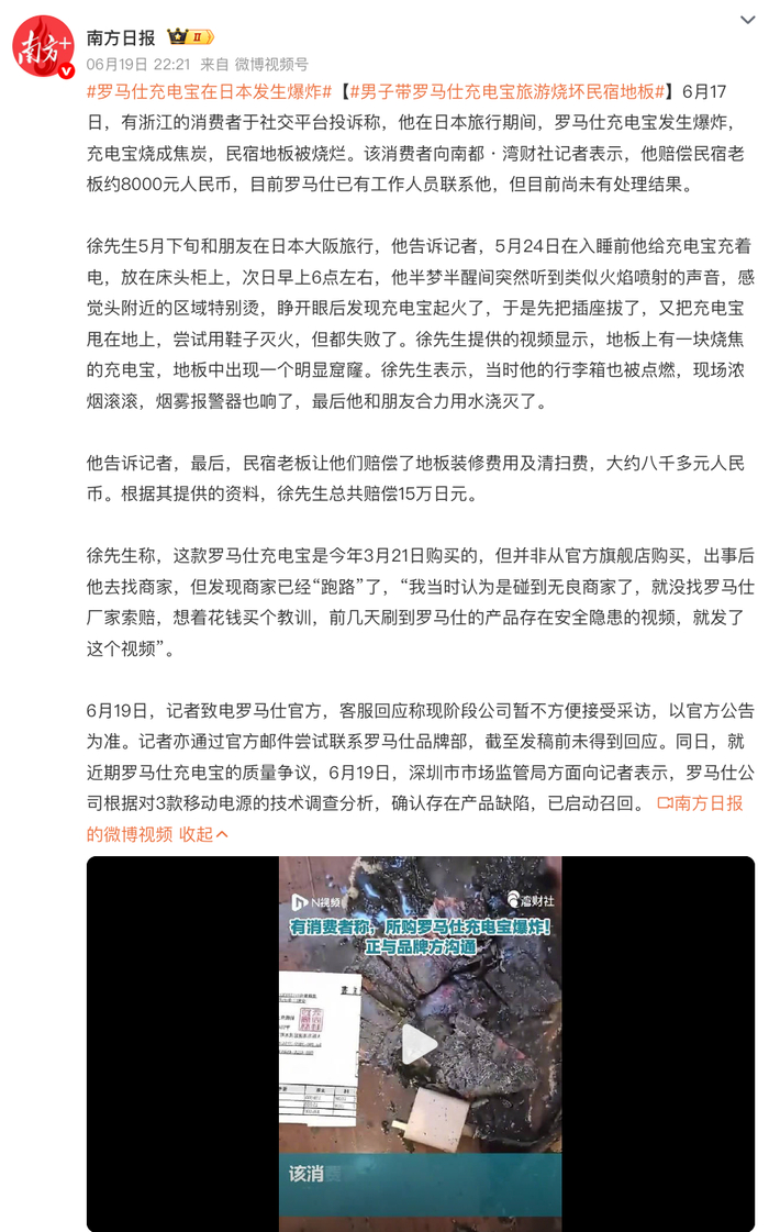 也因为罗马仕召回事件引发广泛讨论,不少之前爆炸事件也被联系起来,比如某浙江消费者今年5月在日本旅行时就因自己携带的罗马仕充电宝爆炸烧坏民宿地板赔偿了15万日元(折合人民币约7400元左右)。大家生活中有碰到充电宝自燃的吗?