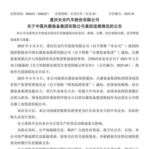 6月初,长安汽车发布公告称,接到兵器装备集团通知,兵器装备集团收到国务院国有资产监督管理委员会(下称“国务院国资委”)通知,经国务院批准,对兵器装备集团实施分立。兵器装备汽车业务分立为一家独立中央企业,由国务院国资委履行出资人职责;国务院国资委按程序将分立后的兵器装备集团股权作为出资注入中国兵器工业集团有限公司。本次分立后,长安汽车间接控股股东将变更为汽车业务分立的中央企业,实际控制人未发生变化。