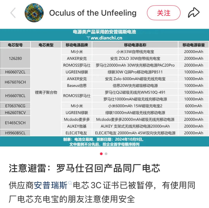 作为补充,网传存在问题的电芯供应商为安普瑞斯,目前所有电芯产品3C证书已被暂停,除了Anker,还供应有罗马仕、绿联、倍思、小米等。