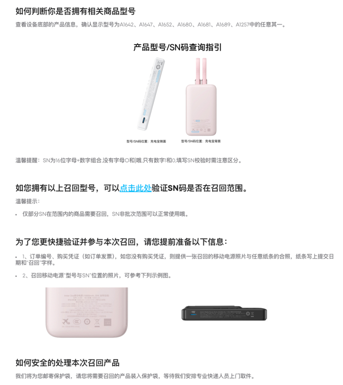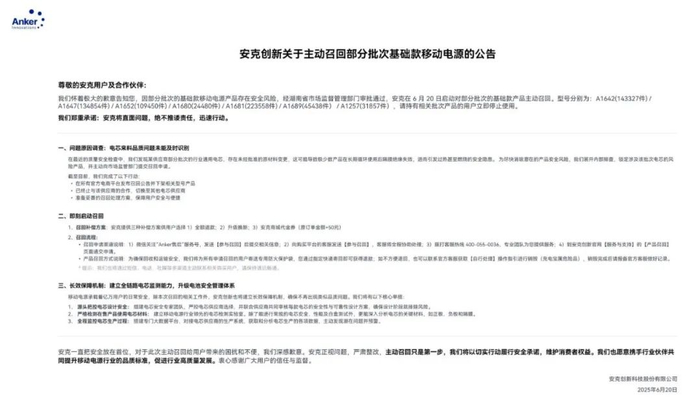 如上图所见,6月20日安克官网更新召回公告,表示因部分批次的基础款移动电源产品存在安全风险,经湖南省市场监督管理部门审批通过,安克在6月20日启动对部分批次的基础款产品主动召回。型号分别为:A1642(143327件)/A1647(134854件)/A1652(109450件)/A1680(24480件)/A1681(223558件)/A1689(45438件)/A1257(31857件),请持有相关批次产品的用户立即停止使用。