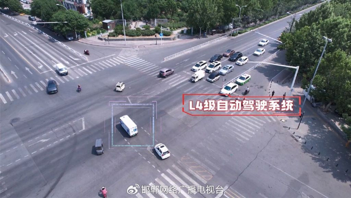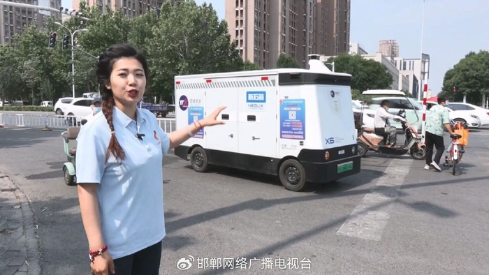 记者 刘静娴:我现在就在廊坊街头,带大家解锁新型的快递配送方式,无人快递车。大家可以看到我身后就是新型的无人快递车,它不仅能精准识别行人和车辆自动避让,而且还能精准识别红绿灯。