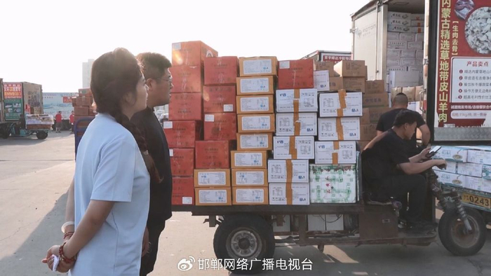 记者 刘静娴:现在是清晨6点半,在河北天环冷链物流基地货物装载区,已是车水马龙的繁忙景象了。我们工人师傅正在有条不紊地将货物装载到车里。再过几个小时,这些货物就能飞入百姓的餐桌上了。