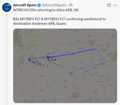 以媒曝飞行追踪数据:两架B-2轰炸机从美国本土起飞,飞往关岛美军基地。