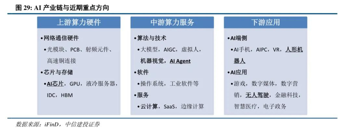 人工智能:1) 受益于大厂加速AI与业务结合、Agent及多模态加速渗透,AI算力消耗开始从训练走向推理,并带来显著的算力增量。建议重视海外算力新技术以及增量变化,尤其是随着机柜式方案放量,重点关注液冷、PCB、铜连接等领域。2) 国内自主可控大势所趋。首先是AI芯片,其次是随着国内头部云厂商下半年算力消耗迈向50万亿+token大关之际,建议关注在出货量、生态和产品力上具有领先的公司。考虑到国产芯片制程、工艺以及明年国内客户机柜方案落地,建议重视国产电源、铜链接、液冷等相关标的。3) Agent成为全球科技巨头发力方向,B和C端均开始产品快速迭代,C端更重视综合能力,B端更强调对业务流的理解、群体智能和专业Agent打造,预计各类Agent将进入快速落地阶段。