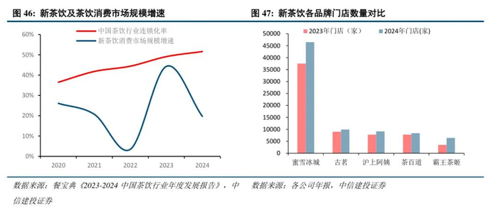 新消费产业覆盖多个赛道,包括新茶饮,潮玩,珠宝,美妆个护,宠物食品等,各个赛道均表现亮眼。以蜜雪冰城为代表的新茶饮行业市场规模不断扩张。