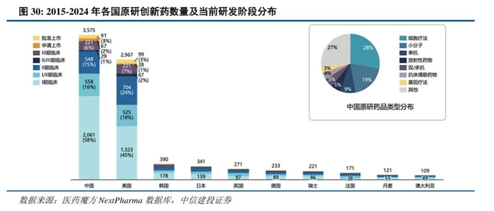 中国企业原研创新药数量增长迅猛,FIC(First-in-Class,同类首创)数量明显增加。2015年中国自研进入临床的FIC创新药仅有9个,占比不足10%,而到了2024年有120个,占比超过30%。2021年数量首次超过欧洲,位居全球第二,仅次于美国。