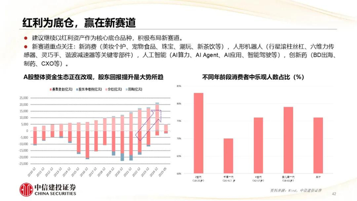 红利为底仓,拥抱“新机智药”新赛道。继续看好以红利资产作为底仓品种的配置策略,同时积极拥抱“新机智药”等新赛道:新消费(美妆个护、宠物食品、珠宝、潮玩、新茶饮等),人形机器人(行星滚柱丝杠、六维力传感器、灵巧手、谐波减速器等关键零部件),人工智能(AI算力、AI Agent、AI应用、智能驾驶等),创新药(BD出海、制药、CXO等)。