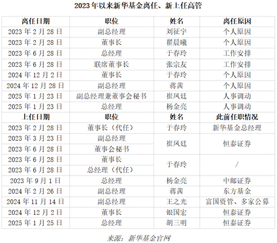 2023年2月,时任新华基金总经理于春玲代任董事长,6月其董事长资格获监管核准,卸任了总经理一职,由于新任总经理尚未上任,仍然代任总经理。