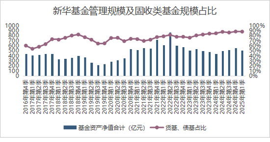 和大部分公募机构一样,新华基金也存在重固收、轻权益的现象,近几年固收类基金规模占比整体呈上升趋势,截至2025年一季度末,货币基金、债券基金规模合计448.83亿元,占比88.1%。