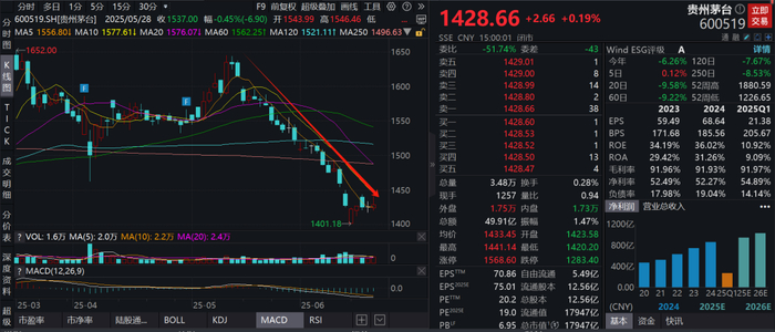 5月15日开始,贵州茅台股价持续阴跌,从5月14日的1634.99元一路跌至1401.18元,差点跌破1400元大关,一个月时间跌了12.6%,最新市值不足1.8万亿元。