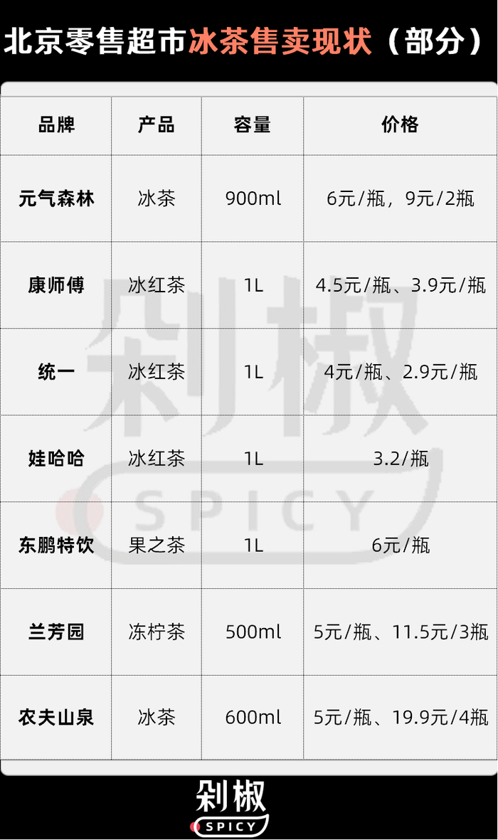 其中,4元、1L的康师傅和部分零售超市低至2.9元、1L的统一冰红茶是无数人心中的不可替代。相比之下,农夫山泉冰茶5元、600ml的售价相对较高。