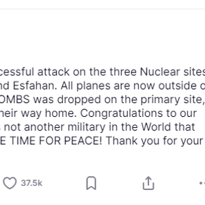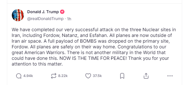 他在其社交媒体平台Truth Social上写道:“我们成功打击了福尔多、纳坦兹和伊斯法罕三处伊朗核设施。所有战机现已撤离伊朗领空。针对首要目标福尔多核设施,我方投掷了满载的炸弹。所有战机均安全返航。”