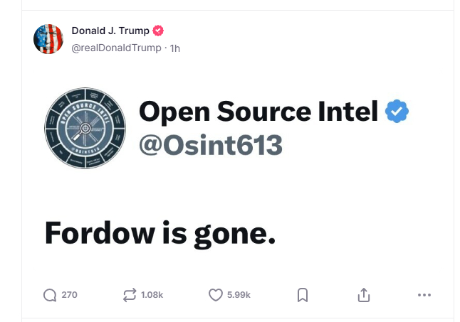 随后不久,特朗普又在Truth Social上发布了一张图。根据图片上文字的意思,外界猜测,特朗普是指“伊朗的福尔多(核设施)已经不存在了”。