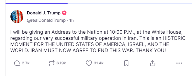 特朗普还在Truth Social上宣布,他将在美国东部时间晚上10点(北京时间上午10点)向全国发表讲话。特朗普称,这对美国、以色列和全世界是一个历史性的时刻,伊朗必须同意结束这场战争。